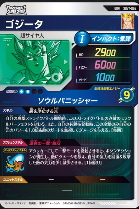 ポルンガなど「エリア必殺技エナジー+1」系のカードと組み合わせて、ガード無視のワンキルデッキが流行るのか、強いのか、超ゴジータのパワー値10,800の威力がどんなものかが見ものです。